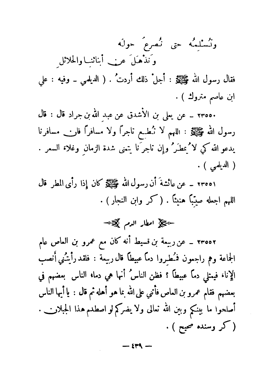 23552- عن ربيعة بن قسيط أنه كان مع عمرو بن العاص عام الجماعة وهم راجعون فمطروا دما عبيطا قال ربيعة: "فلقد رأيتني أنصب الإناء فيمتلى دما عبيطا؟ فظن الناس أنها هي دماء الناس بعضهم في بعضهم فقام عمرو بن العاص فأثنى على الله بما هو أهله" ثم قال: "يا أيها الناس أصلحوا ما بينكم وبين الله تعالى ولا يضركم لو اصطدم هذا الجبلان". (كر وسنده صحيح) .