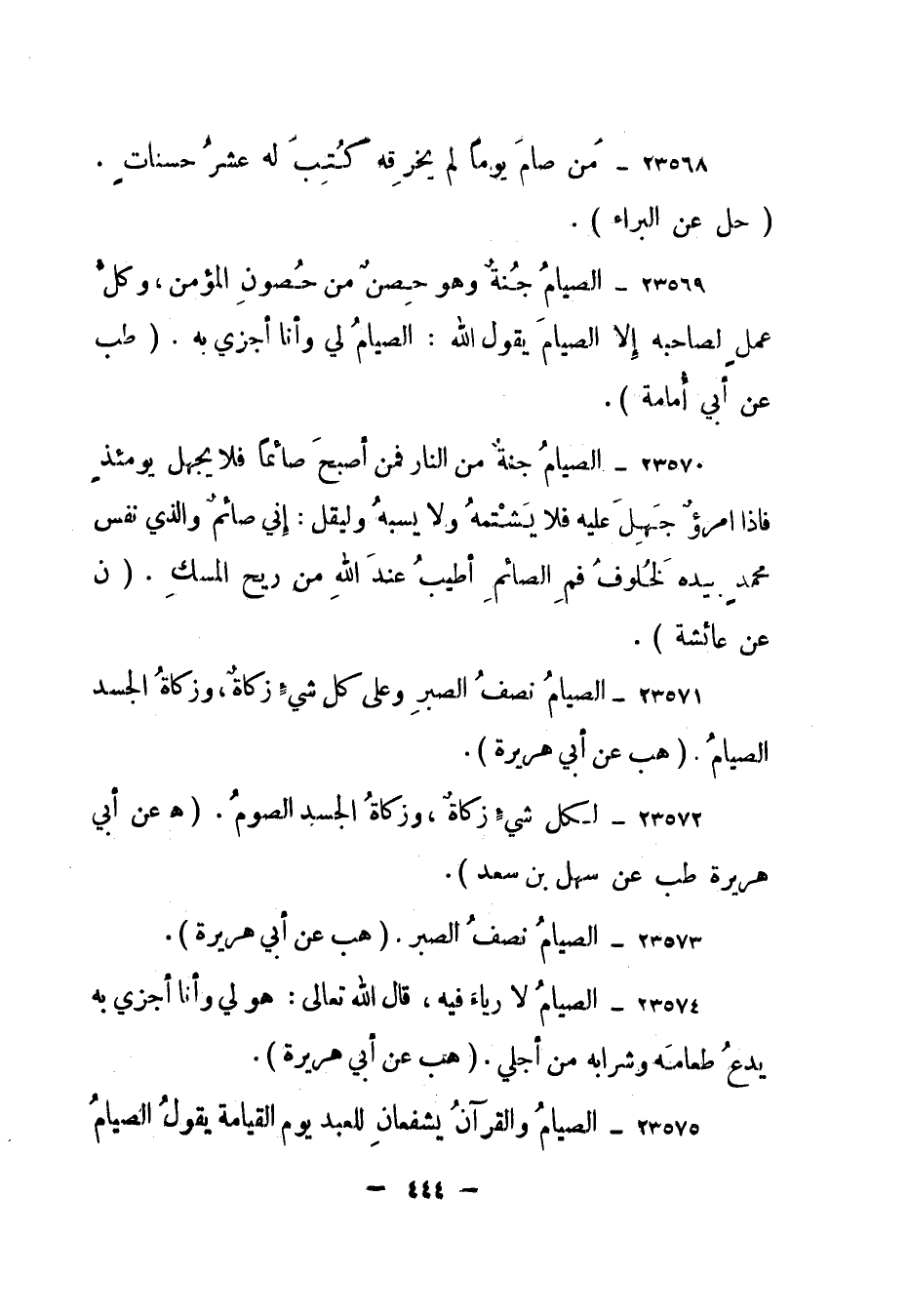 23571- الصيام نصف الصبر وعلى كل شيء زكاة، وزكاة الجسد الصيام. (هب عن أبي هريرة) .