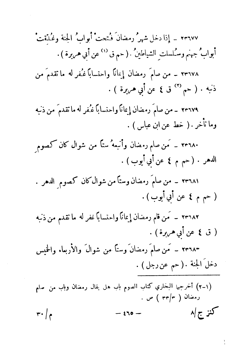 23681- من صام رمضان وستا من شوال كان كصوم الدهر. (حم م 4 عن أبي أيوب) .