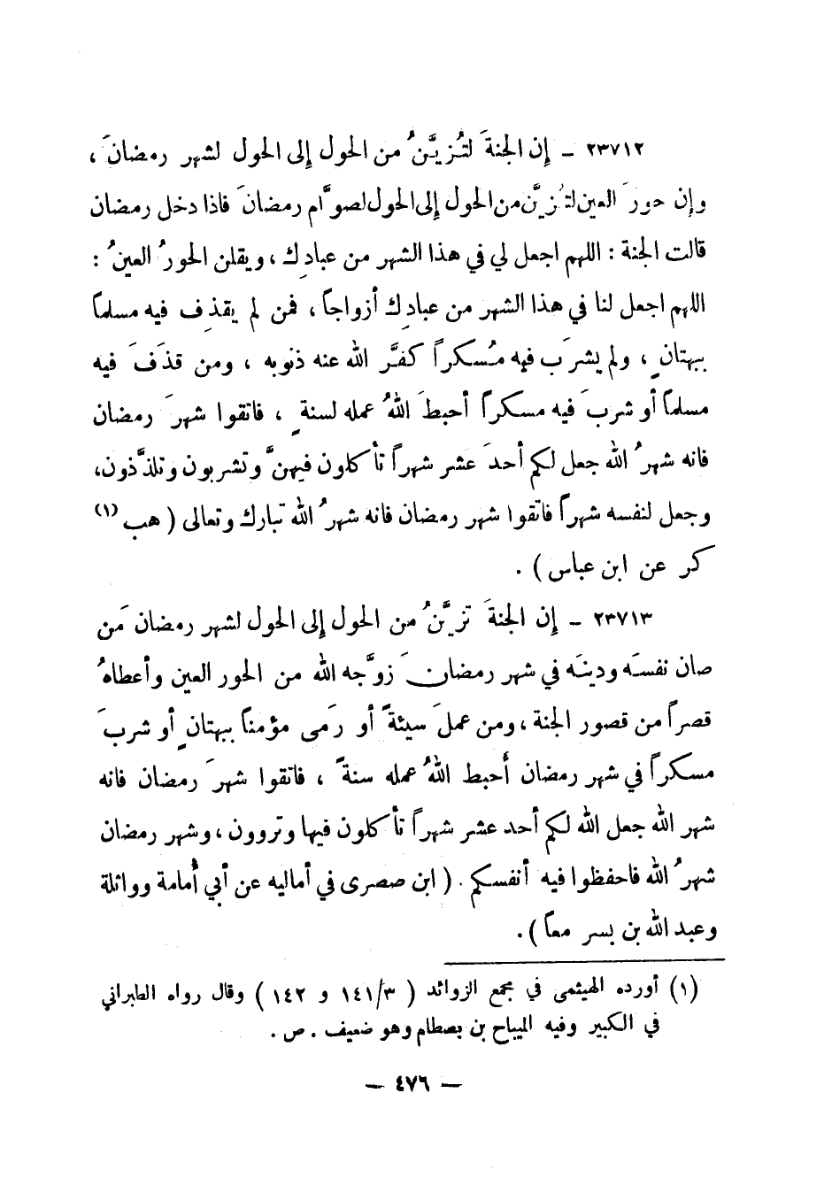 23713- إن الجنة تزين من الحول إلى الحول لشهر رمضان من صان نفسه ودينه في شهر رمضان زوجه الله من الحور العين وأعطاه قصرا من قصور الجنة، ومن عمل سيئة أو رمى مؤمنا ببهتان أو شرب مسكرا في شهر رمضان أحبط الله عمله سنة، فاتقوا شهر رمضان فإنه شهر الله جعل الله لكم أحد عشر شهرا تأكلون فيها وتروون، وشهر رمضان شهر الله فاحفظوا فيه أنفسكم. (ابن صصرى في أماليه عن أبي أمامة وواثلة وعبد الله بن بسر معا) .