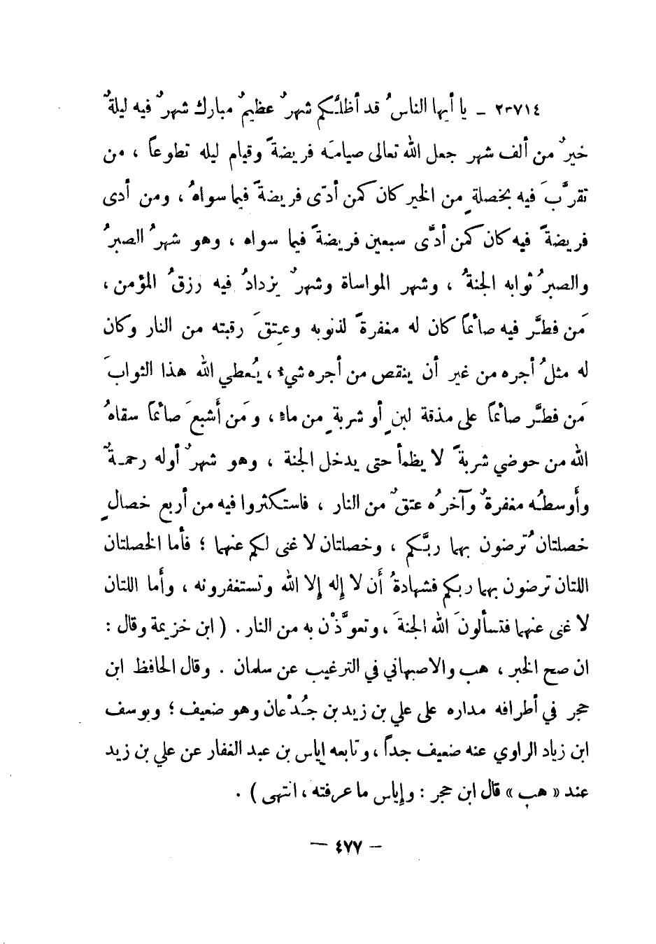 23714- يا أيها الناس قد أظلكم شهر عظيم مبارك شهر فيه ليلة خير من ألف شهر جعل الله تعالى صيامه فريضة وقيام ليله تطوعا، من تقرب فيه بخصلة من الخير كان كمن أدى فريضة فيما سواه، ومن أدى فريضة فيه كان كمن أدى سبعين فريضة فيما سواه، وهو شهر الصبر والصبر ثوابه الجنة، وشهر المواساة وشهر يزداد فيه رزق المؤمن، من فطر فيه صائما كان له مغفرة لذنوبه وعتق رقبته من النار وكان له مثل أجره من غير أن ينقص من أجره شيء، يعطي الله هذا الثواب من فطر صائما على مذقة لبن أو شربة من ماء، ومن أشبع صائما سقاه الله من حوضي شربة لا يظمأ حتى يدخل الجنة، وهو شهر أوله رحمة وأوسطه مغفرة وآخره عتق من النار، فاستكثروا فيه من أربع خصال خصلتان ترضون بهما ربكم، وخصلتان لا غنى لكم عنهما؛ فأما الخصلتان اللتان ترضون بهما ربكم فشهادة أن لا إله إلا الله وتستغفرونه، وأما اللتان لا غنى عنهما فتسألون الله الجنة، وتعوذون به من النار. (ابن خزيمة وقال: "إن صح الخبر، هب والأصبهاني في الترغيب عن سلمان". وقال الحافظ ابن حجر في أطرافه مداره على علي بن زيد بن جدعان وهو ضعيف؛ ويوسف ابن زياد الراوي عنه ضعيف جدا، وتابعه اياس بن عبد الغفار عن علي بن زيد عند (هب) " قال ابن حجر: "وإياس ما عرفته،" انتهى) .