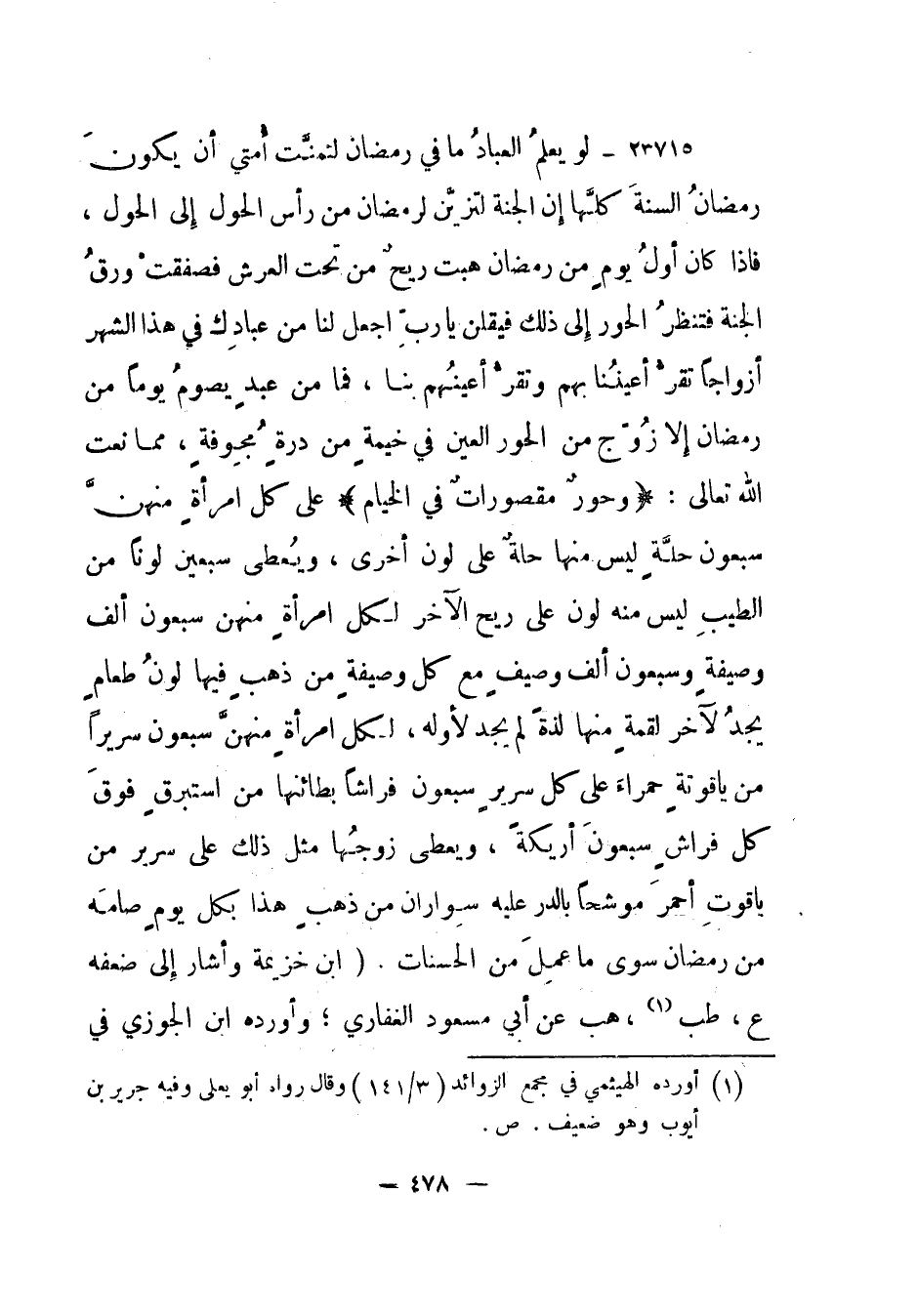 23715- لو يعلم العباد ما في رمضان لتمنت أمتي أن يكون رمضان السنة كلها إن الجنة لتزين لرمضان من رأس الحول إلى الحول، فإذا كان أول يوم من رمضان هبت ريح من تحت العرش فصفقت ورق الجنة فتنظر الحور إلى ذلك فيقلن يا رب اجعل لنا من عبادك في هذا الشهر أزواجا تقر أعيننا بهم وتقر أعينهم بنا، فما من عبد يصوم يوما من رمضان إلا زوج من الحور العين في خيمة من درة مجوفة، مما نعت الله تعالى: {حُورٌ مَقْصُورَاتٌ فِي الْخِيَامِ} على كل امرأة منهن سبعون حلة ليس منها حلة على لون أخرى، ويعطى سبعين لونا من الطيب ليس منه لون على ريح الآخر لكل امرأة منهن سبعون ألف وصيفة وسبعون ألف وصيف مع كل وصيفة من ذهب فيها لون طعام يجد لآخر لقمة منها لذة لم يجد لأوله، لكل امرأة منهن سبعون سريرا من ياقوتة حمراء على سرير سبعون فراشا بطائنها من استبرق فوق كل فراش سبعون أريكة، ويعطى زوجها مثل ذلك على سرير من ياقوت أحمر موشحا بالدر عليه سواران من ذهب هذا بكل يوم صامه من رمضان سوى ما عمل من الحسنات. (ابن خزيمة وأشار إلى ضعفه ع، طب (1) ، هب عن أبي مسعود الغفاري؛ وأورده ابن الجوزي في