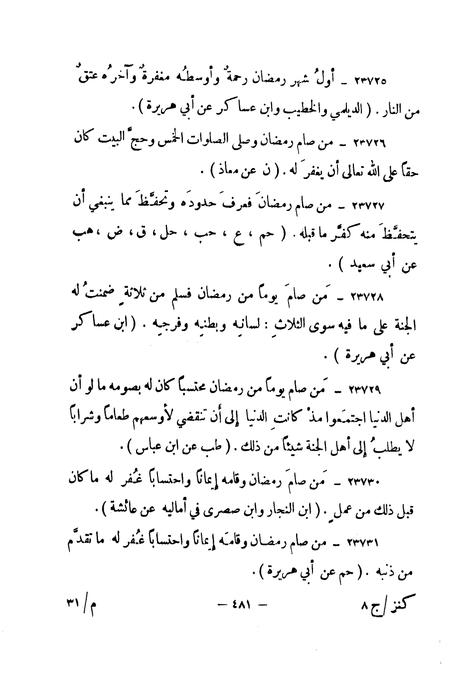23730- من صام رمضان وقامه إيمانا واحتسابا غفر له ما كان قبل ذلك من عمل. (ابن النجار وابن صصرى في أماليه عن عائشة) .