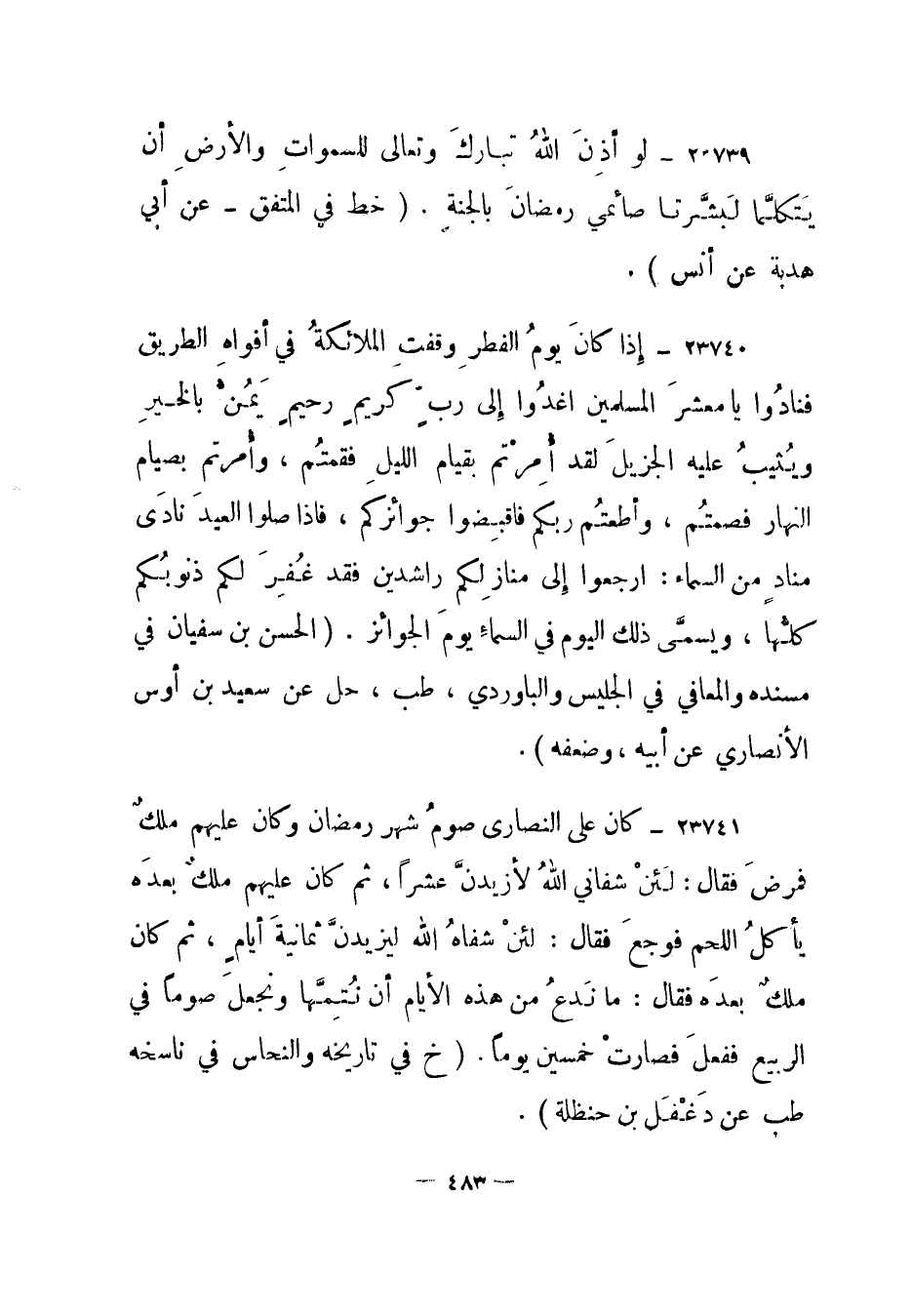 23739- لو أذن الله تبارك وتعالى للسموات والأرض أن يتكلما لبشرتا صائمي رمضان بالجنة. (خط في المتفق - عن أبي هدبة عن أنس) .