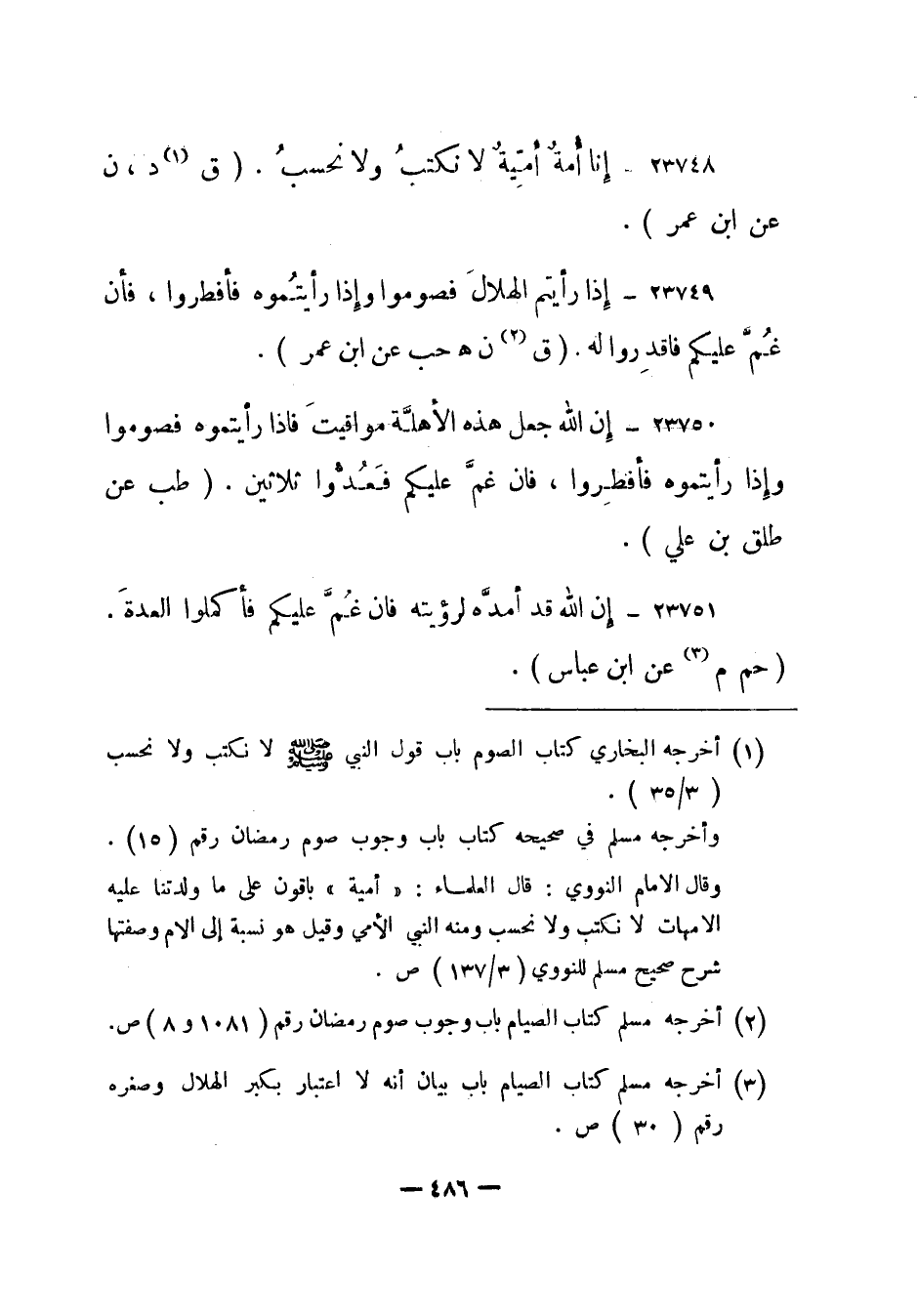 23748- إنا أمة أمية لا نكتب ولا نحسب. (ق (1) د، ن عن ابن عمر) .