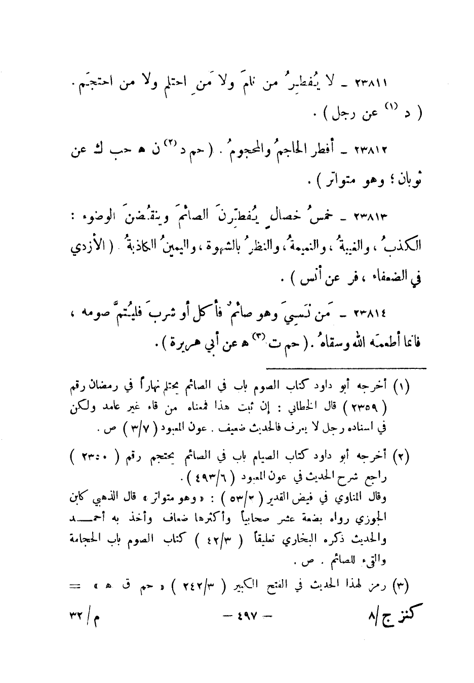 23812- "أفطر الحاجم والمحجوم". (حم د (2) ن هـ حب ك عن ثوبان، وهو متواتر) .