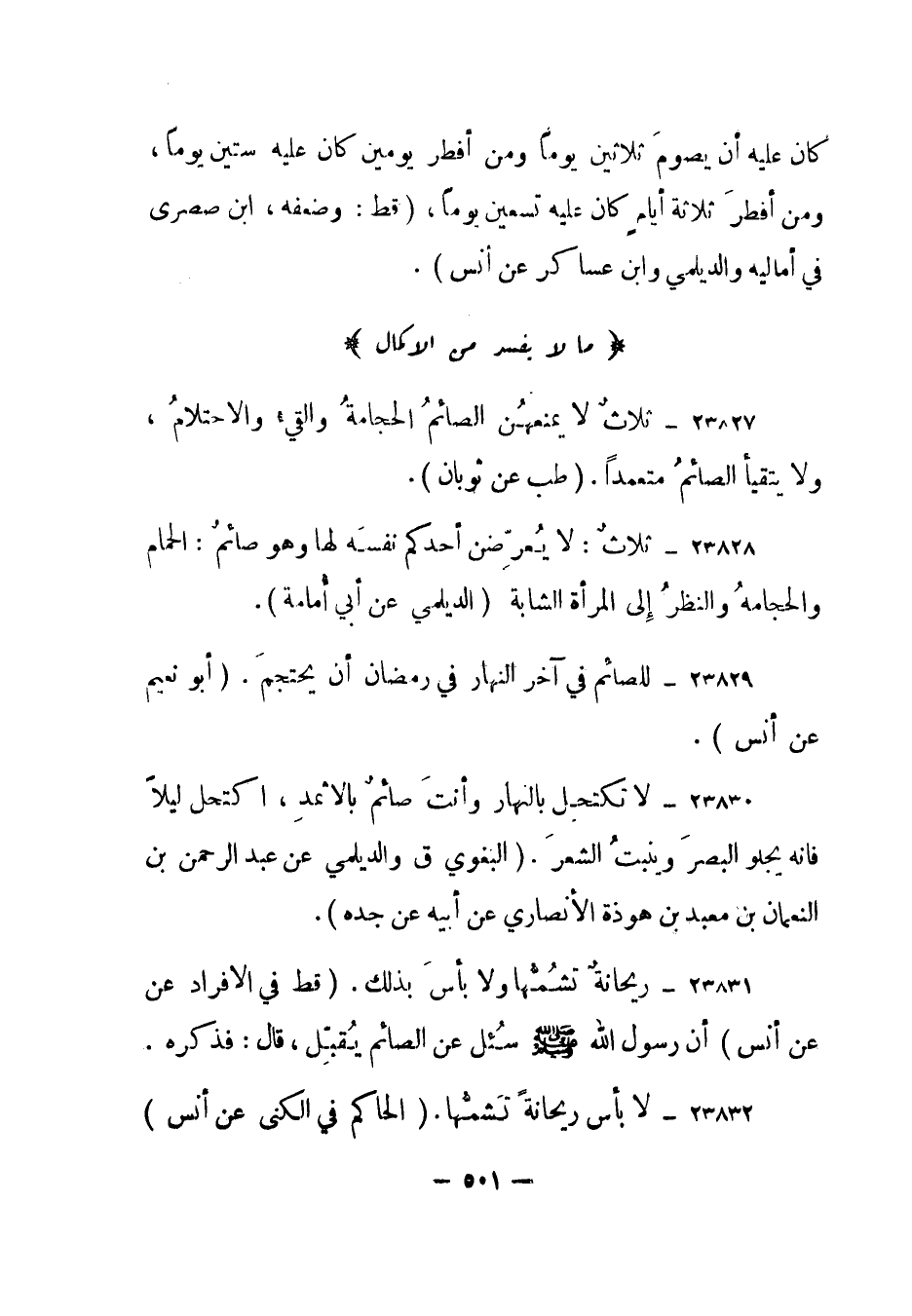 23831- "ريحانة تشمها ولا بأس بذلك". (قط في الأفراد عن أنس) "أن رسول الله صلى الله عليه وسلم سئل عن الصائم يقبل،" قال: "فذكره".