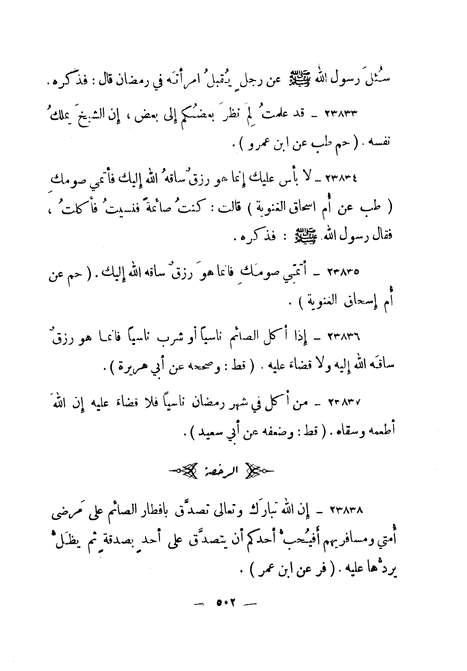 23838- "إن الله تبارك وتعالى تصدق بإفطار الصائم على مرضى أمتي ومسافريهم أفيحب أحدكم أن يتصدق على أحد بصدقة ثم يظل يردها عليه". (فر عن ابن عمر) .