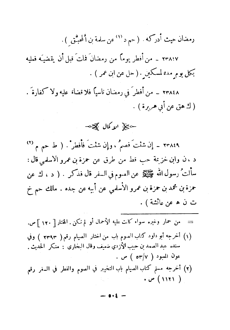23849- "إن شئت فصم، وإن شئت فأفطر". (ط حم م (2) د، ن وابن خزيمة حب قط من طرق عن حكزة بن عمرو الأسلمي قال: "سألت رسول الله صلى الله عليه وسلم عن الصوم في السفر" قال: "فذكر". (د، ك عن حمزة بن محمد بن حمزة بن عمرو الأسلمي عن أبيه عن جده. مالك حم خ ت ن هـ عن عائشة) .