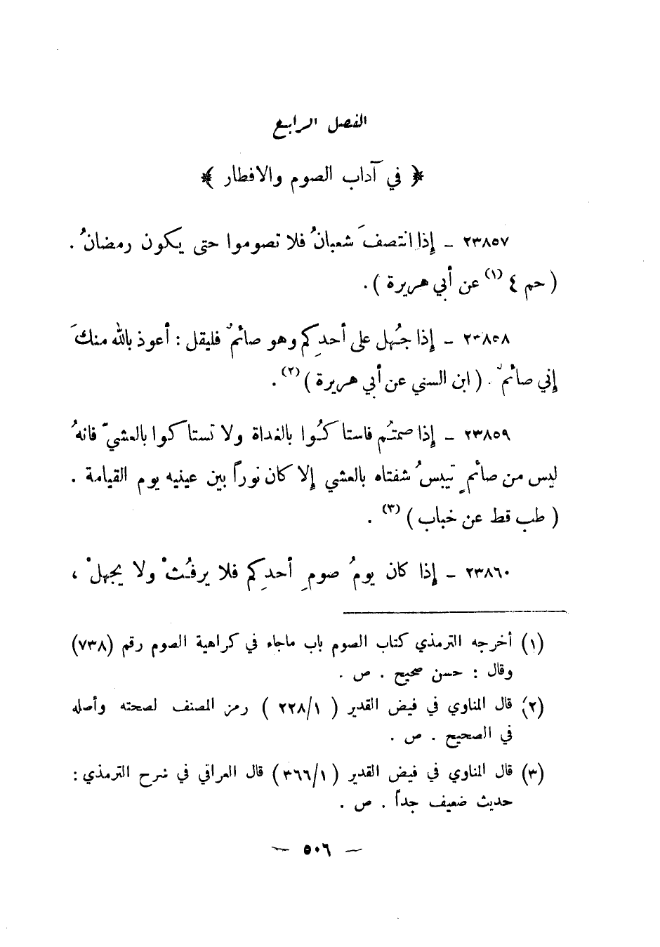 23859- "إذا صمتم فاستاكوا بالغداة ولا تستاكوا بالعشي فإنه ليس من صائم تيبس شفتاه بالعشي إلا كان نورا بين عينيه يوم القيامة". (طب قط عن خباب) . (3)