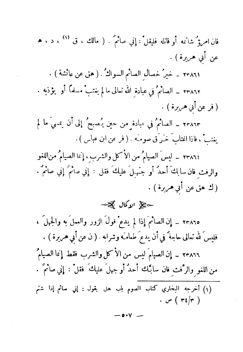 23864- "ليس الصيام من الأكل والشرب، إنما الصيام من اللغو والرفث فإن سابك أحد أو جهل عليك فقل: إني صائم إني صائم". (ك هق عن أبي هريرة) .