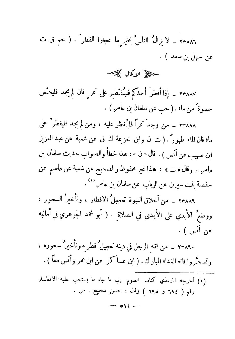 23886- "لا يزال الناس بخير ما عجلوا الفطر". (حم ق ت عن سهل بن سعد) .