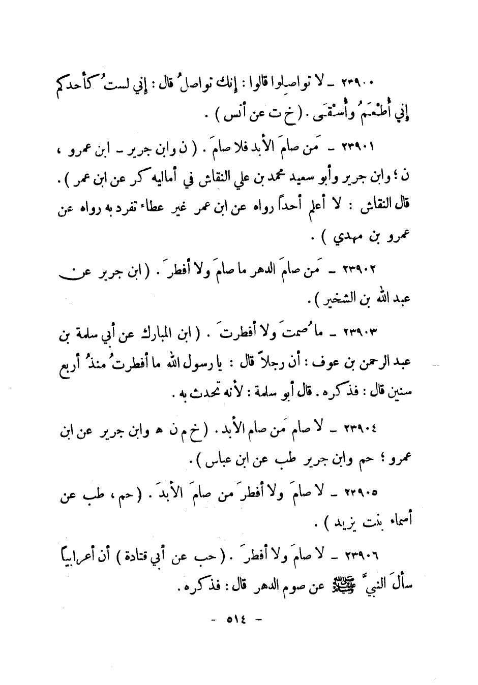 23904- "لا صام من صام الأبد". (خ م ن هـ وابن جرير عن ابن عمرو، حم وابن جرير طب عن ابن عباس) .