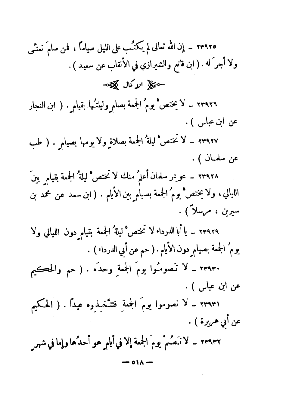 23927- "لا تختص ليلة الجمعة بصلاة ولا يومها بصيام". (طب عن سلمان) .