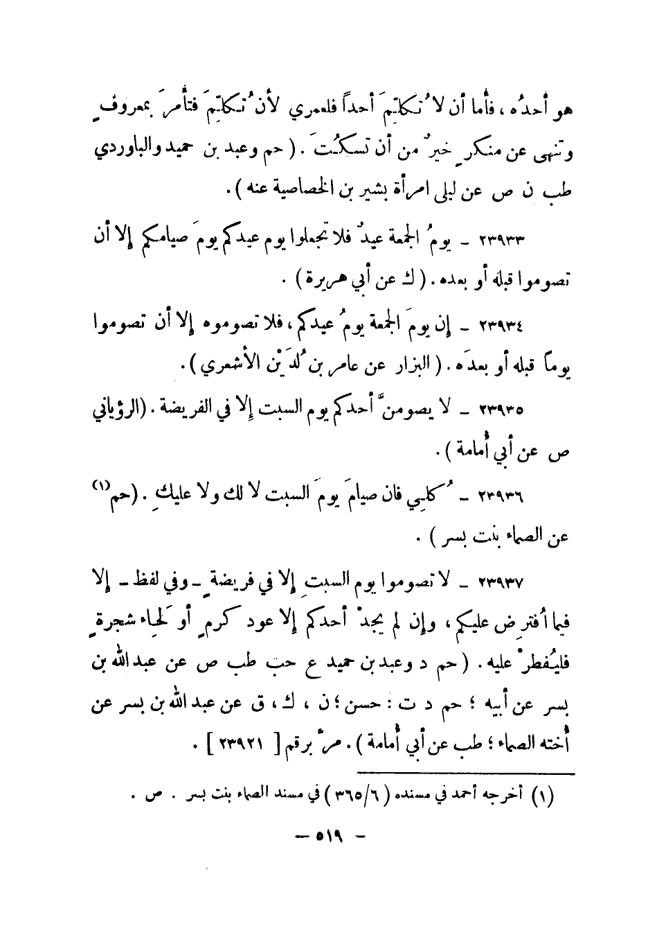 23935- "لا يصومن أحدكم يوم السبت إلا في الفريضة". (الرؤياني ص عن أبي أمامة) .