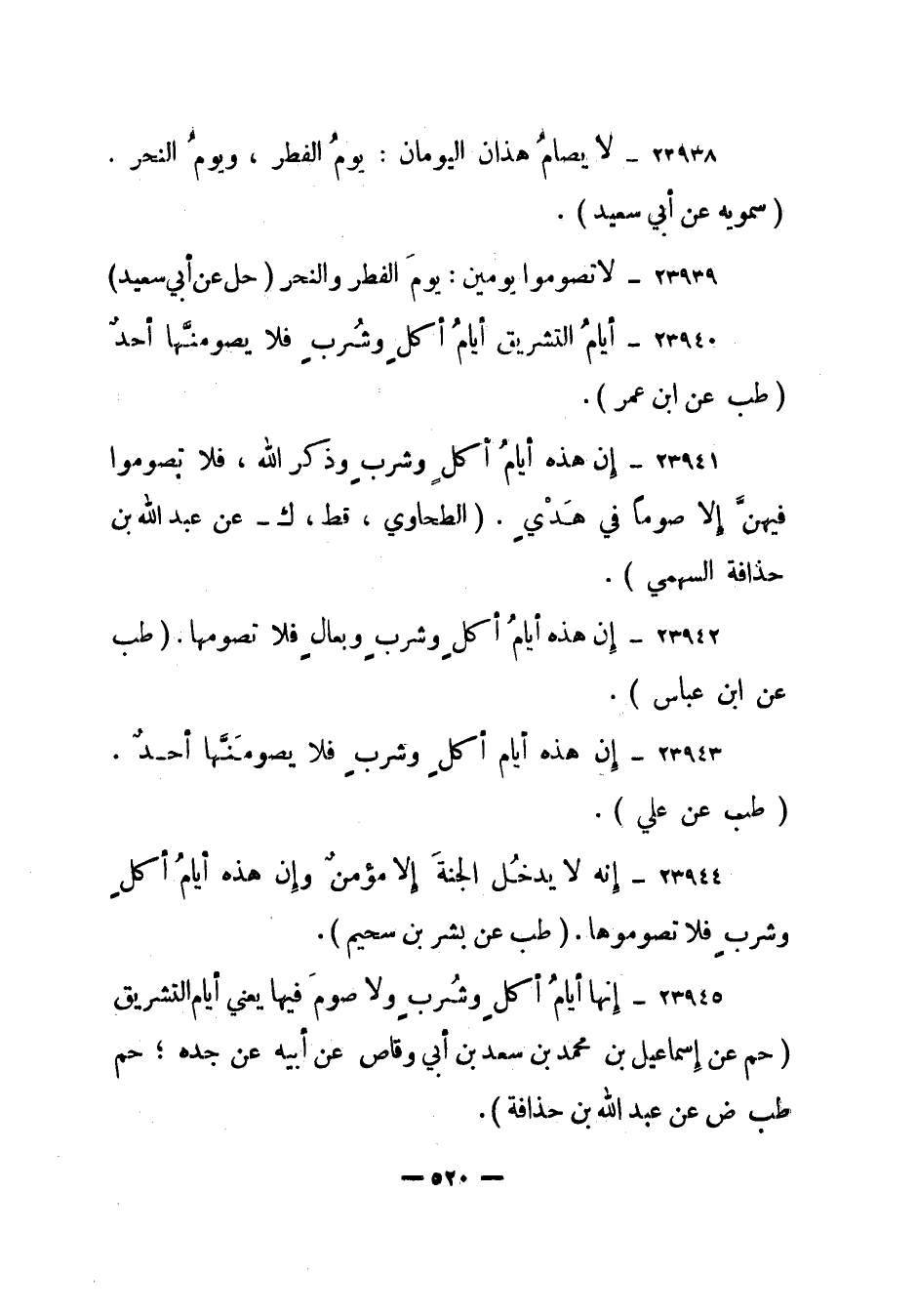 23938- "لا يصام هذان اليومان: يوم الفطر، ويوم النحر". (سمويه عن أبي سعيد) .