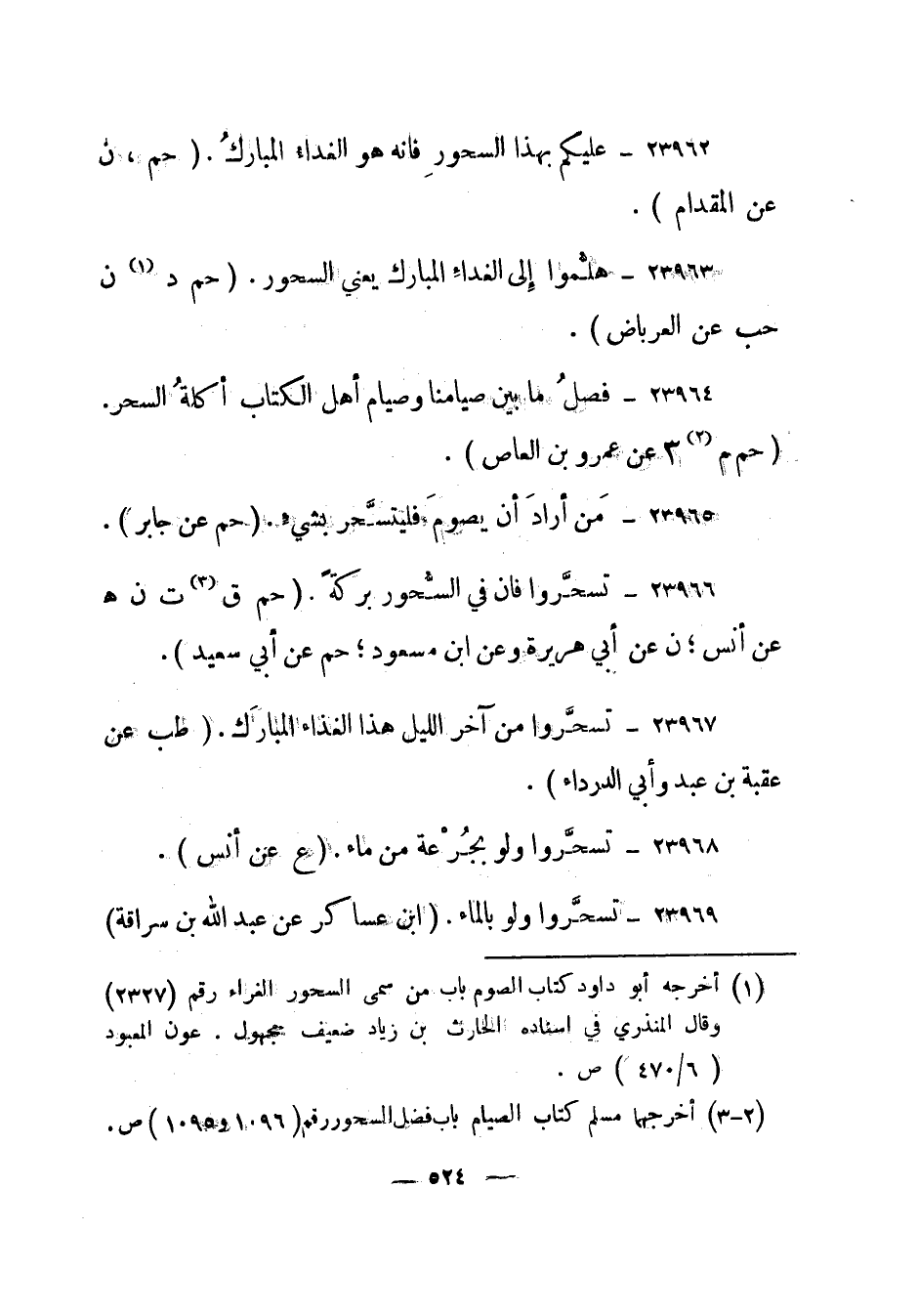 23963- "هلموا إلى الغداء المبارك يعني السحور". (حم د (1) ن حب عن العرباض) .
