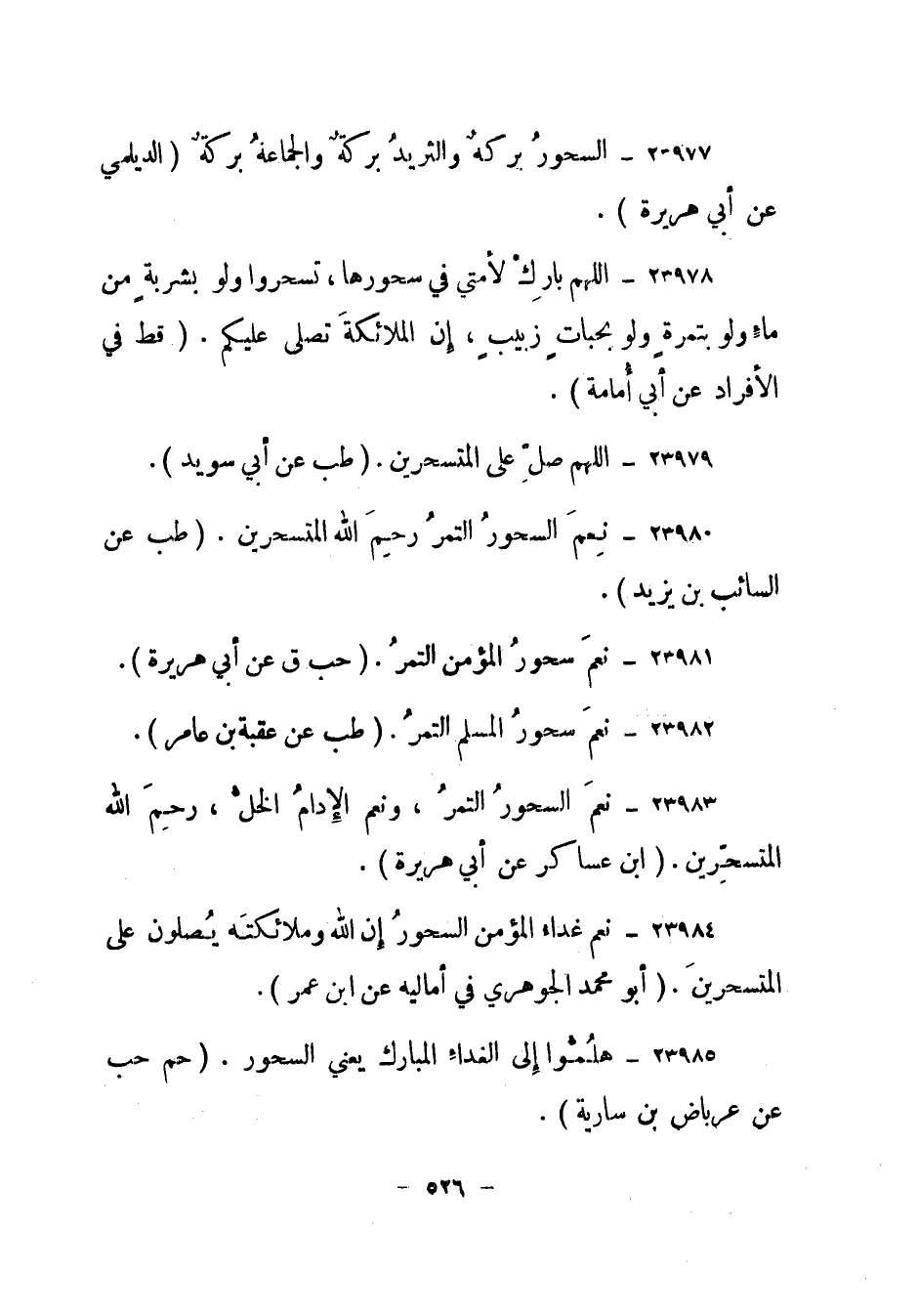 23978- "اللهم بارك لأمتي في سحورها، تسحروا ولو بشربة من ماء ولو بتمرة ولو بحبات زبيب، إن الملائكة تصلى عليكم". (قط في الأفراد عن أبي أمامة) .