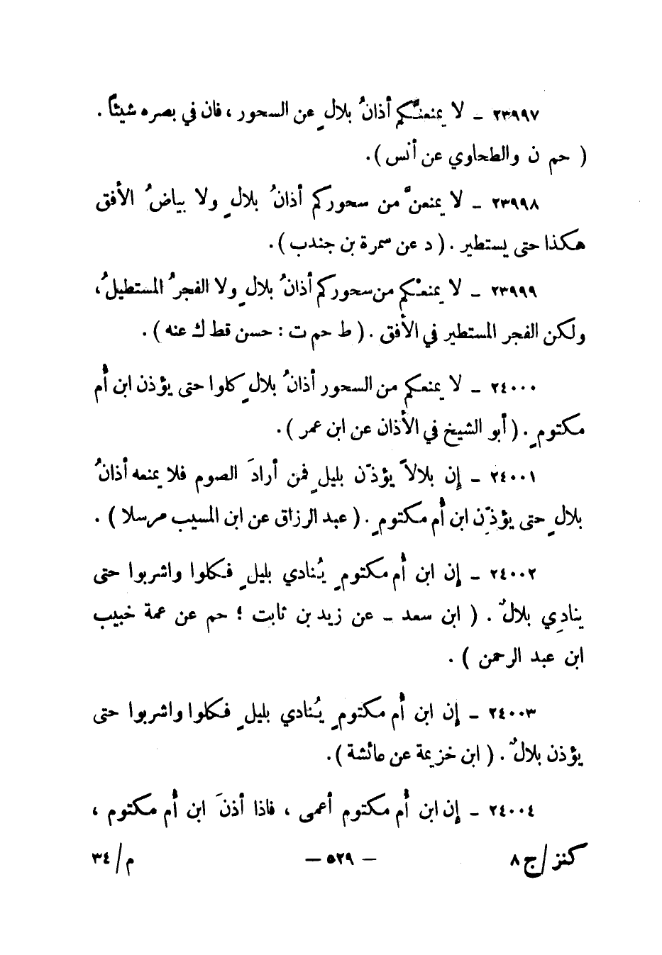 24000- "لا يمنعكم من السحور أذان بلال كلوا حتى يؤذن ابن أم مكتوم". (أبو الشيخ في الأذان عن ابن عمر) .
