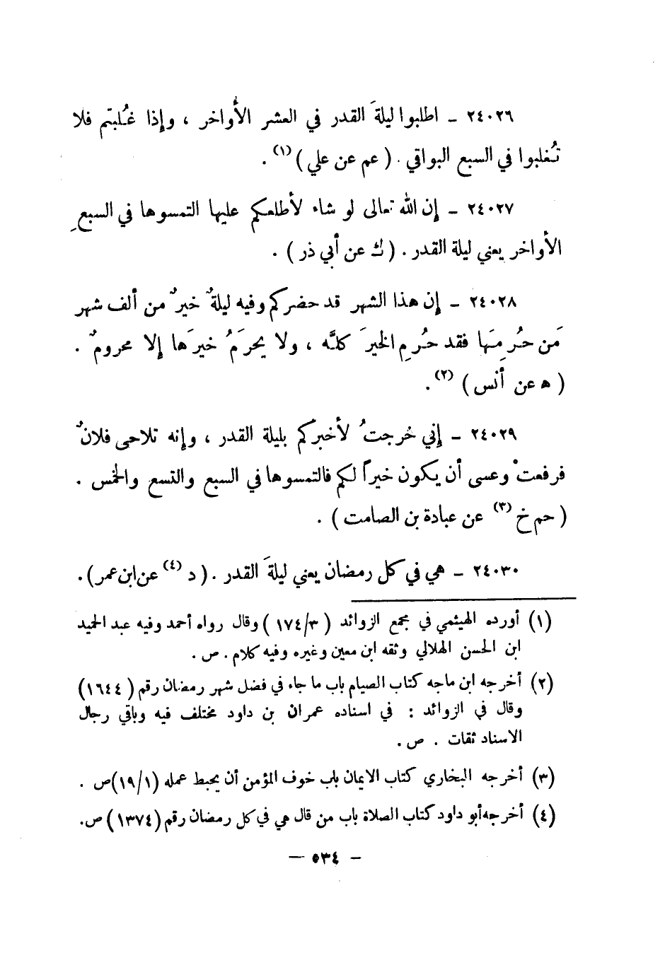 24026- "اطلبوا ليلة القدر في العشر الأواخر، وإذا غلبتم فلا تغلبوا في السبع البواقي". (عم عن علي) (1) .