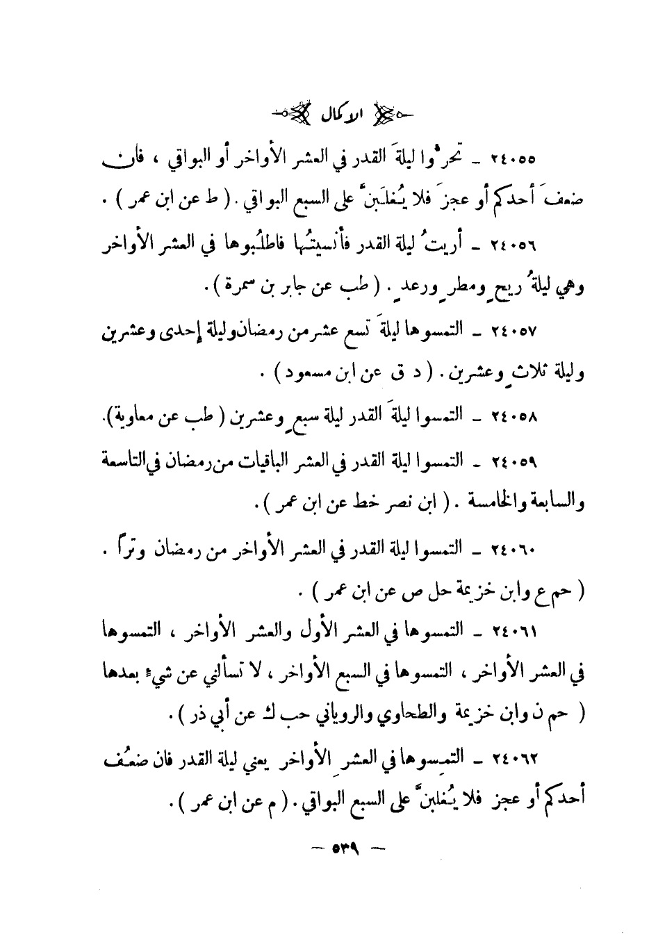 24055- "تحروا ليلة القدر في العشر الأواخر أو البواقي، فإن ضعف أحدكم أو عجز فلا يغلبن على السبع البواقي". (ط عن ابن عمر) .