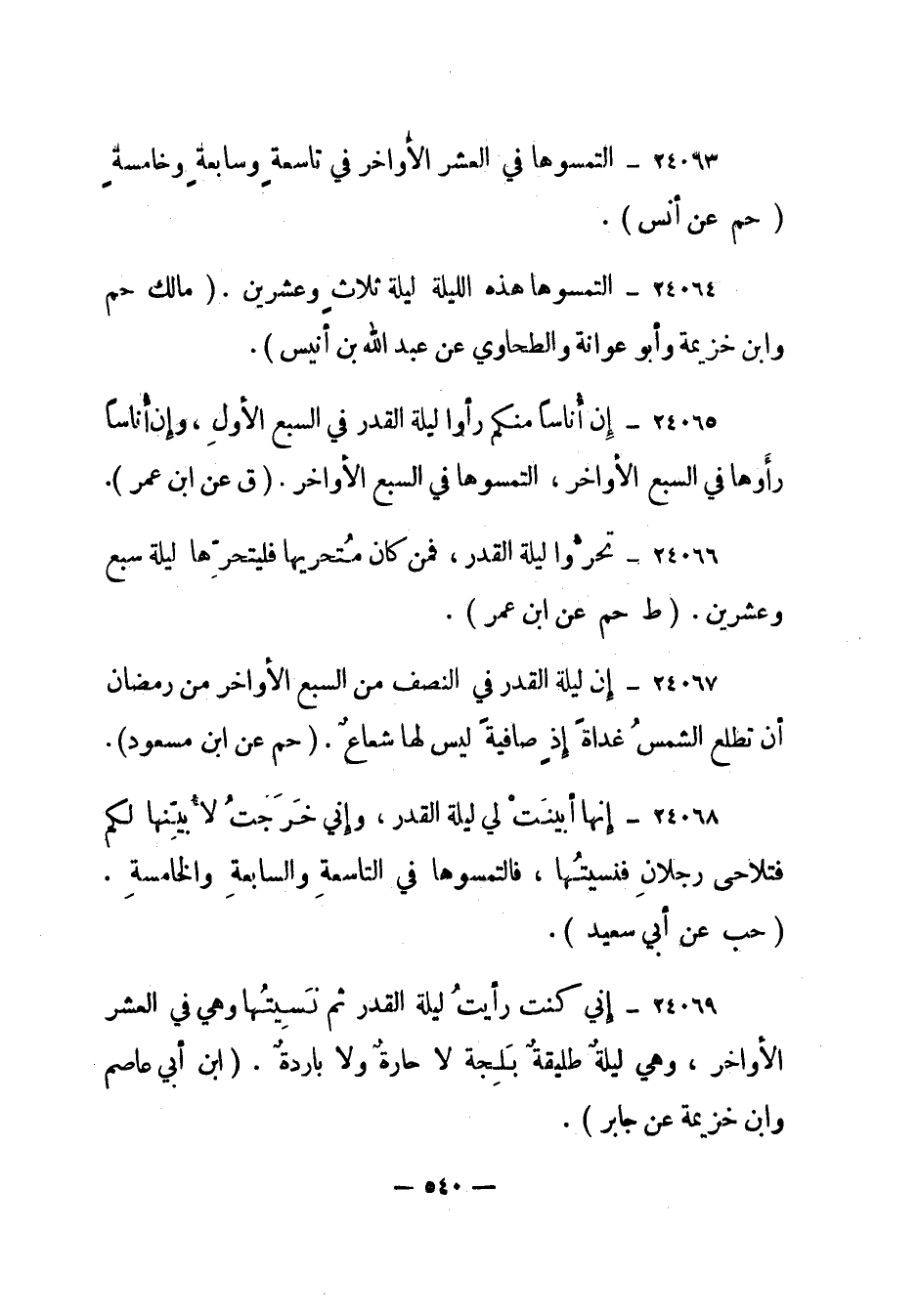 24064- "التمسوها هذه الليلة ليلة ثلاث وعشرين". "مالك حم وابن خزيمة وأبو عوانة والطحاوي عن عبد الله بن أنيس".