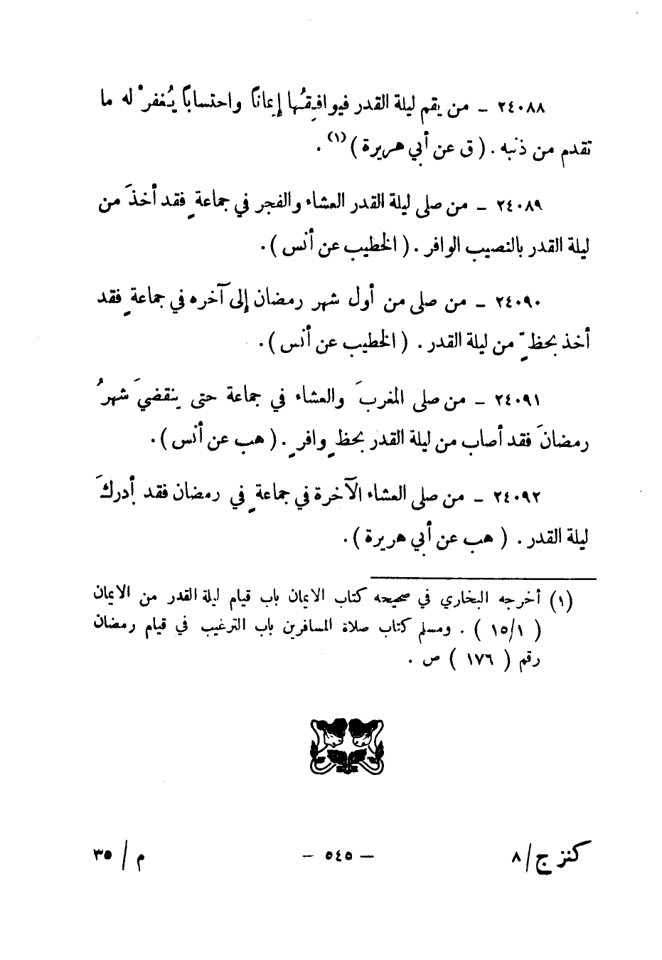 24089- "من صلى ليلة القدر العشاء والفجر في جماعة فقد أخذ من ليلة القدر بالنصيب الوافر". "الخطيب عن أنس".