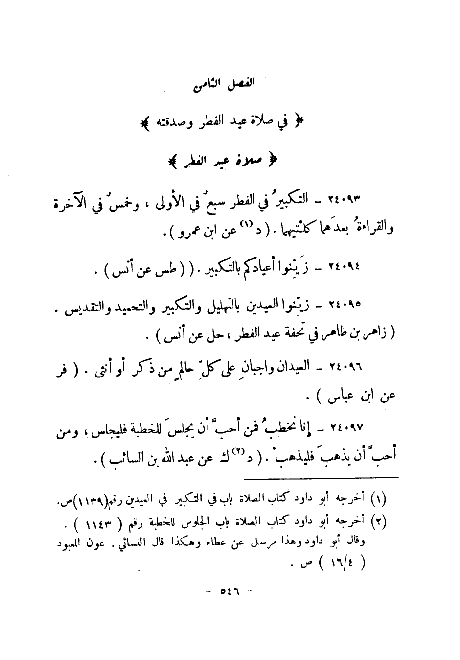 24093- "التكبير في الفطر سبع في الأولى، وخمس في الآخرة والقراءة بعدهما كلتيهما". "د 1 عن ابن عمرو".