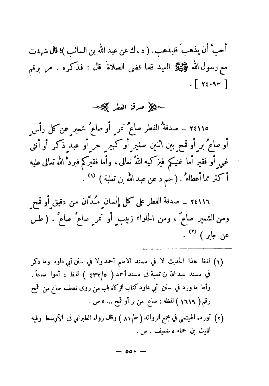 24116- "صدقة الفطر على كل إنسان مدان من دقيق أو قمح ومن الشعير صاع، ومن الحلواء زبيب أو تمر صاع صاع". "طس عن جابر" 2