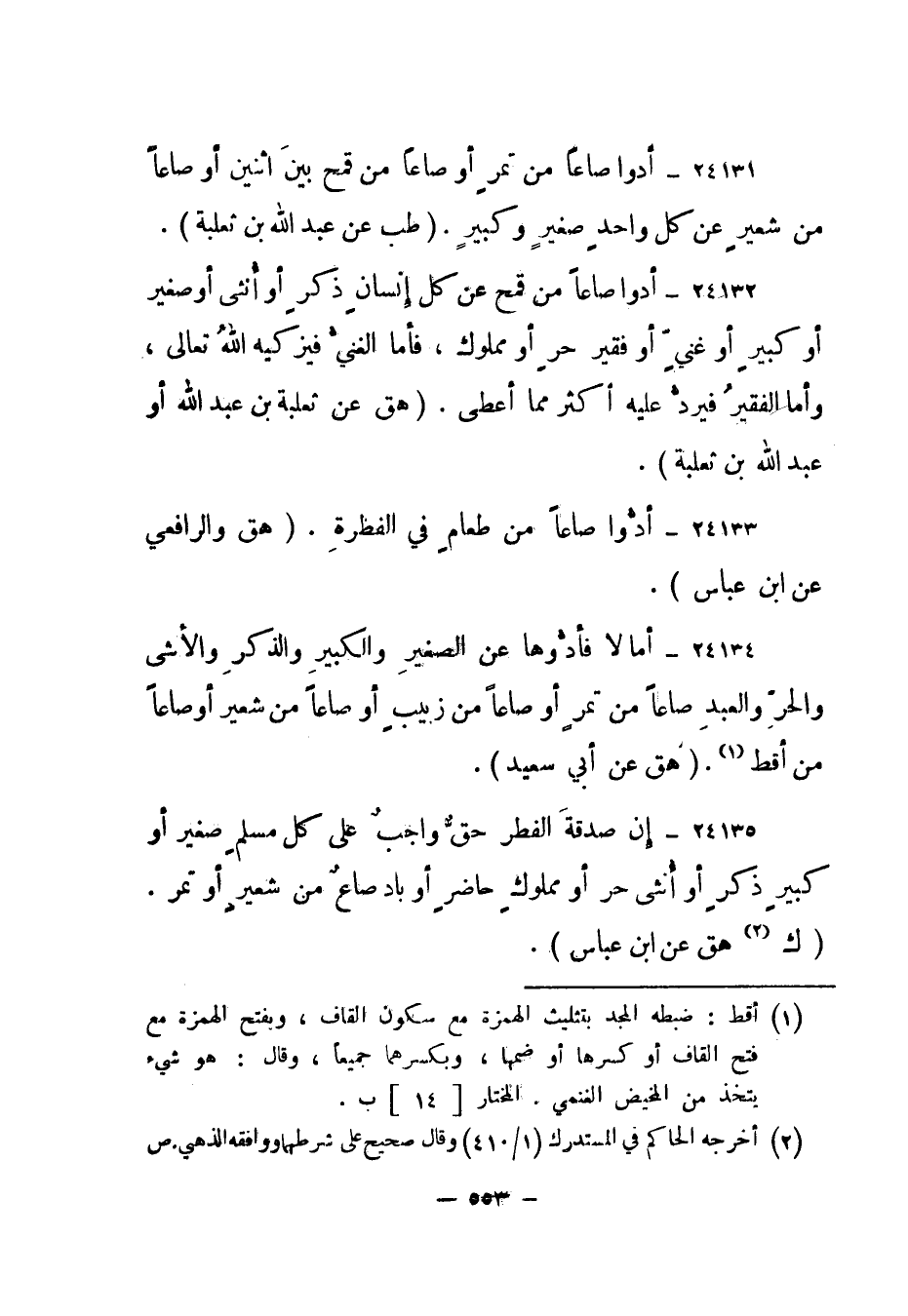 24131- "أدوا صاعا من تمر أو صاعا من قمح بين اثنين أو صاعا من شعير عن كل واحد صغير وكبير". "طب عن عبد الله بن ثعلبة".