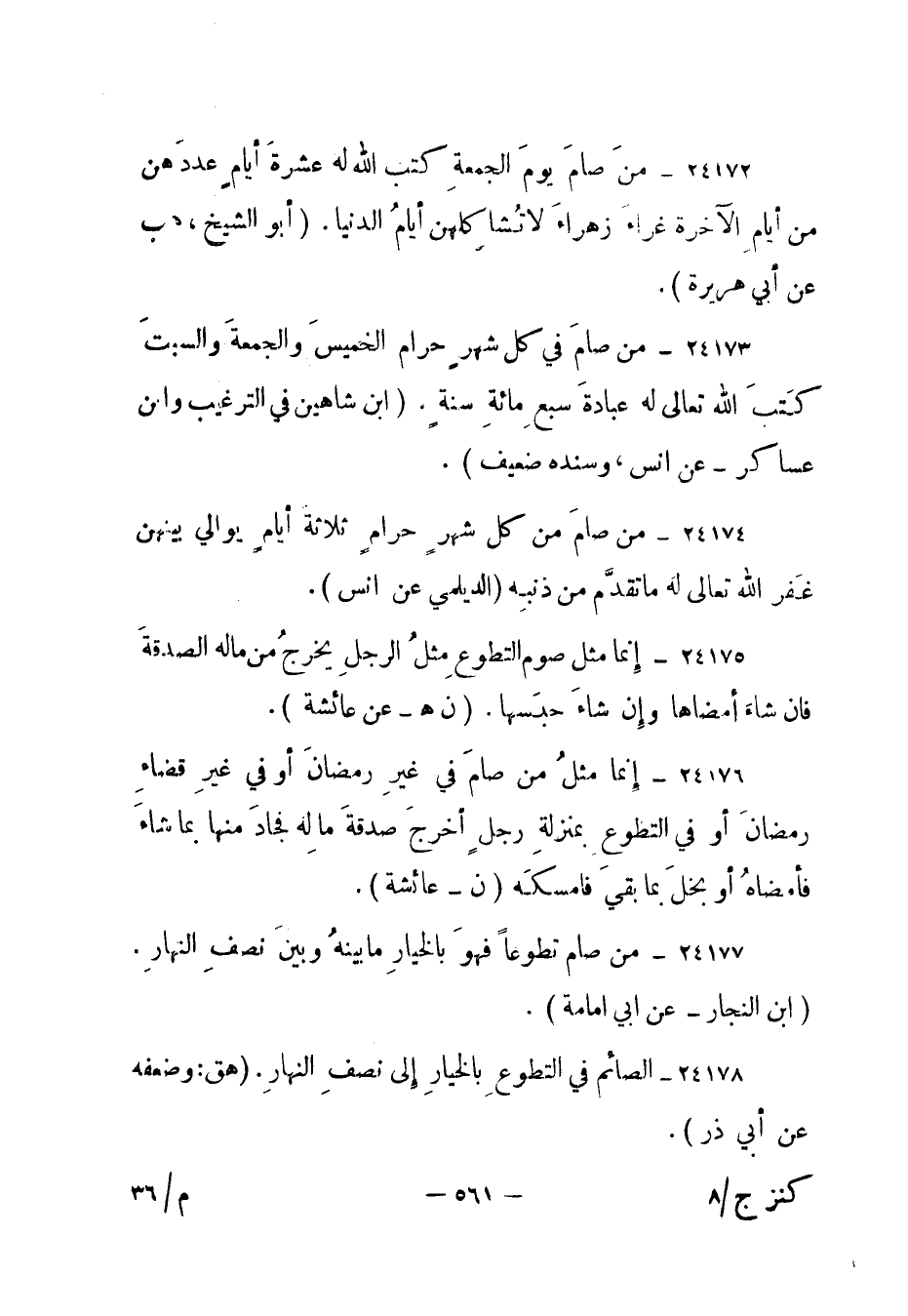 24172- "من صام يوم الجمعة كتب الله له عشرة أيام عددهن من أيام الآخرة غراء زهراء لا تشاكلهن أيام الدنيا". "أبو الشيخ، هب عن أبي هريرة".