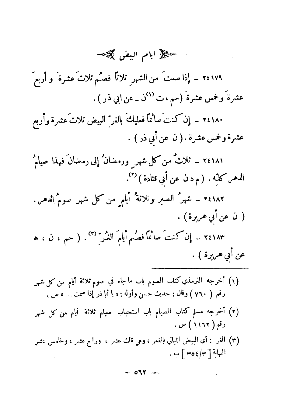 24181- "ثلاث من كل شهر ورمضان إلى رمضان فهذا صيام الدهر كله". "م د ن عن أبي قتادة". 2