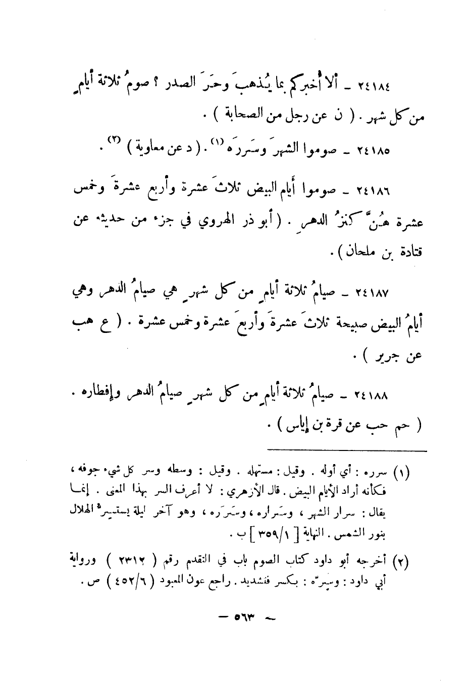 24186- "صوموا أيام البيض ثلاث عشرة وأربع عشرة وخمس عشرة هن كنز الدهر". "أبو ذر الهروي في جزء من حديثه عن قتادة بن ملحان".