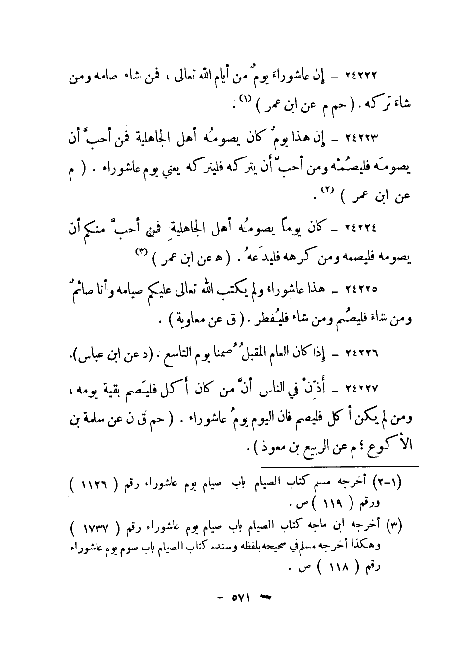 24227- "أذن في الناس أن من كان أكل فليصم بقية يومه، ومن لم يكن أكل فليصم فإن اليوم عاشوراء". "حم ق ن عن سلمة بن الأكوع، م عن الربيع بن معوذ".