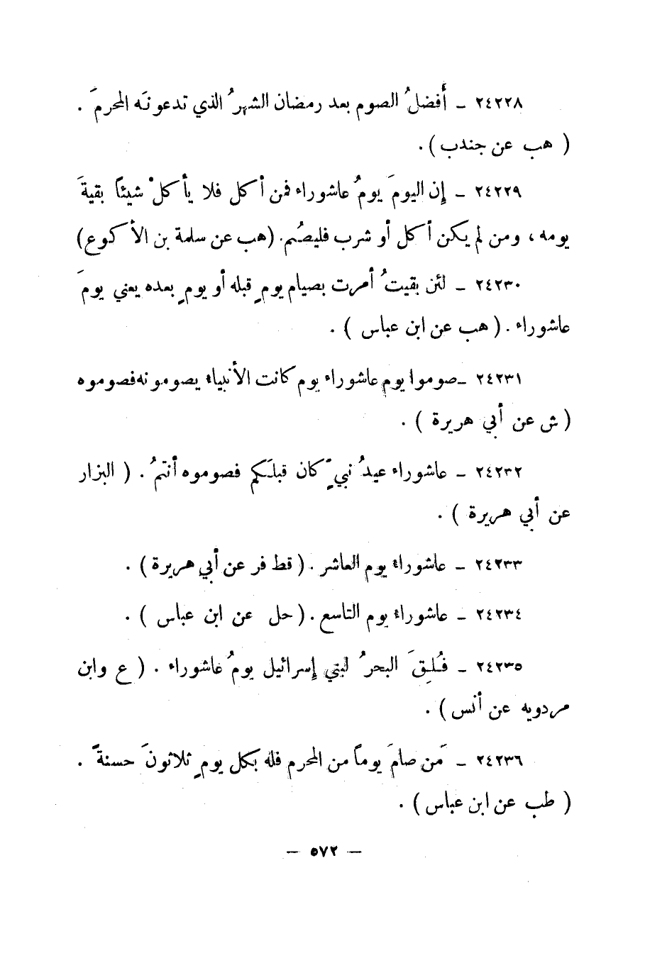 24229- "إن اليوم يوم عاشوراء فمن أكل فلا يأكل شيئا بقية يومه، ومن لم يكن أكل أو شرب فليصم". "هب عن سلمة بن الأكوع".