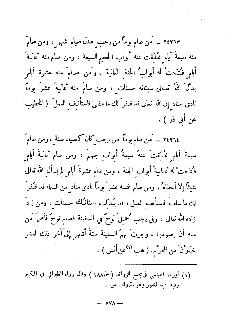 24264- "من صام يوما من رجب كان كصيام سنة، ومن صام سبعة أيام غلقت عنه سبعة أبواب جهنم، ومن صام ثمانية أيام فتحت له ثمانية أبواب الجنة، ومن صام عشرة أيام لم يسأل الله تعالى شيئا إلا أعطاه، ومن صام خمسة عشر يوما نادى مناد من السماء قد غفر لك ما سلف فاستأنف العمل، قد بدلت سيئاتك حسنات، ومن زاد زاده الله تعالى، وفي رجب حمل نوح في السفينة فصام نوح فأمر من معه أن يصوموا، وجرت بهم السفينة ستة أشهر إلى آخر ذلك لعشر خلون من المحرم". "هب 1 عن أنس".