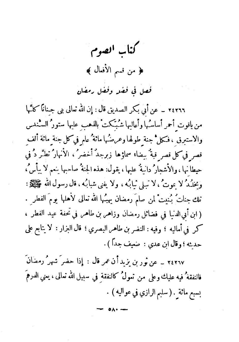 24266- عن أبي بكر الصديق قال: "إن الله تعالى بنى جنانا كلها من ياقوت أحمر أساسها وأعاليها شبكت بالذهب عليها ستور السندس والاستبرق، فكل جنة طولها وعرضها مائة عام في كل جنة مائة ألف قصر في كل قصر قبة بيضاء سماؤها زبرجد أخضر، الأنهار تطرد في حيطانها، والأشجار دانية عليها، يقول: هذه الجنة صاحبها ينعم لا ييأس، ويخلد لا يموت، لا تبلى ثيابه، ولا يفنى شبابه، قال رسول الله صلى الله عليه وسلم: تلك جنات بنيت لمن صام رمضان يهبها الله تعالى لأهلها يوم الفطر ". "ابن أبي الدنيا في في فضائل رمضان وزاهر بن طاهر في تحفة عيد الفطر، كر في أماليه؛ وفيه: النضر بن طاهر البصري؛ قال البزار: "لا يتابع على حديثه"، وقال ابن عدي: "ضعيف جدا".