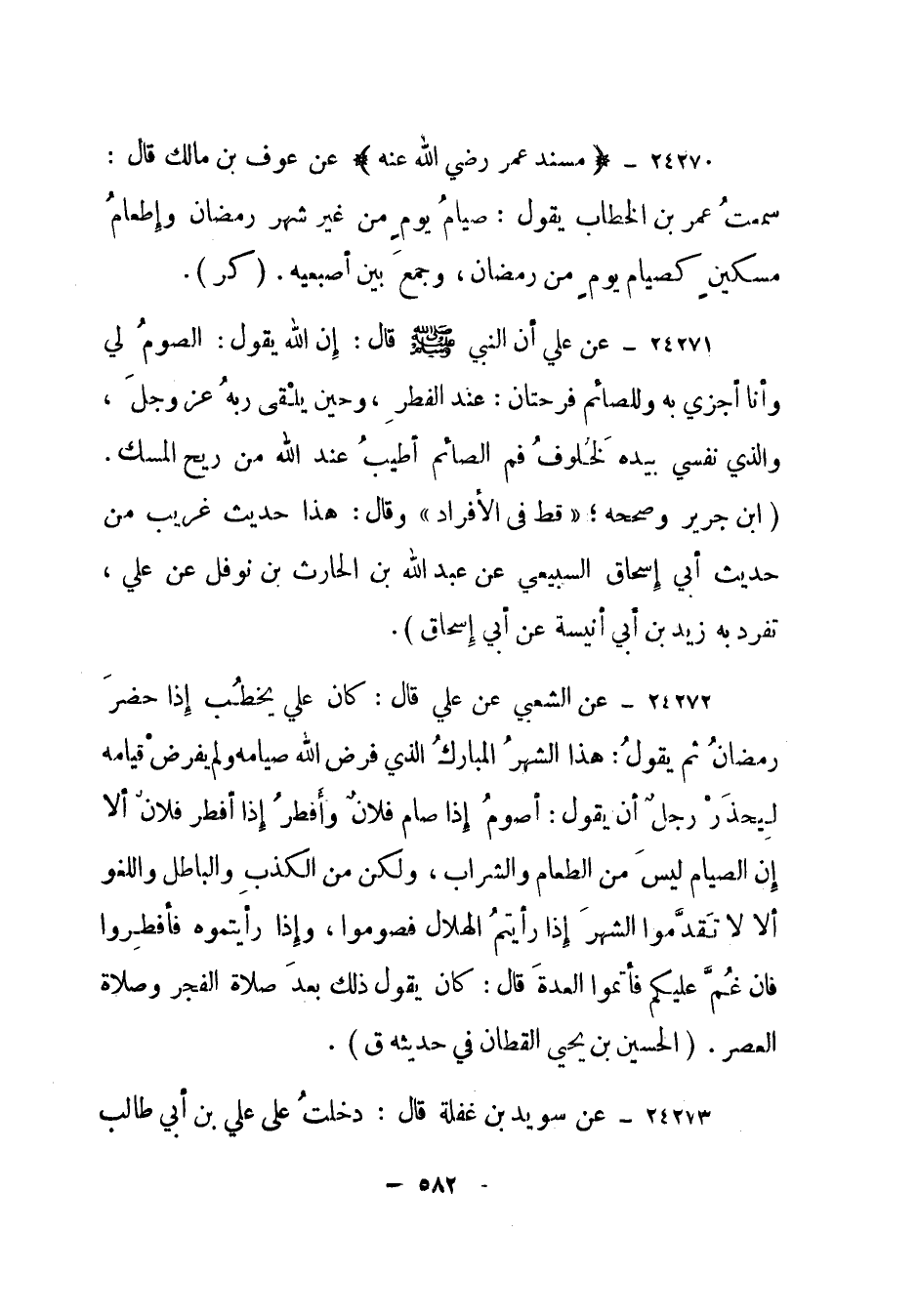 24272- عن الشعبي عن علي قال: "كان علي يخطب إذا حضر رمضان ثم يقول: هذا الشهر المبارك الذي فرض الله صيامه ولم يفرض قيامه ليحذر رجل أن يقول: أصوم إذا صام فلان وأفطر إذا أفطر فلان ألا إن الصيام ليس من الطعام والشراب، ولكن من الكذب والباطل واللغو ألا لا تقدموا الشهر إذا رأيتم الهلال فصوموا، وإذا رأيتموه فأفطروا فإن غم عليكم فأتموا العدة قال: كان يقول ذلك بعد صلاة الفجر وصلاة العصر". "الحسين بن يحيى القطان في حديثه ق".