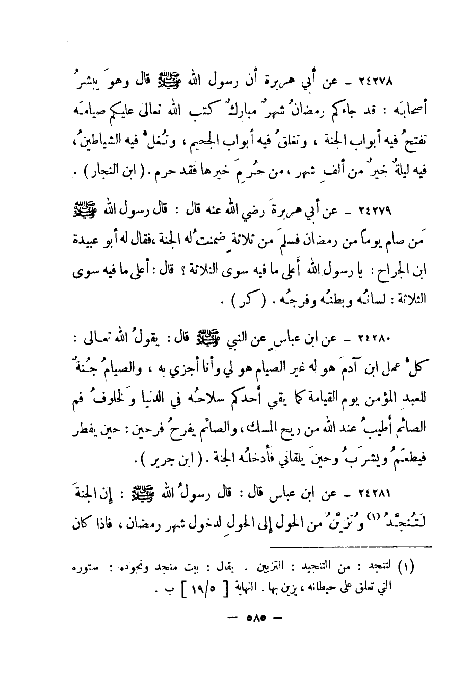 24281- عن ابن عباس قال: "قال رسول الله صلى الله عليه وسلم: إن الجنة لتنجد 1 وتزين من الحول إلى الحول لدخول شهر رمضان، فإذا كان