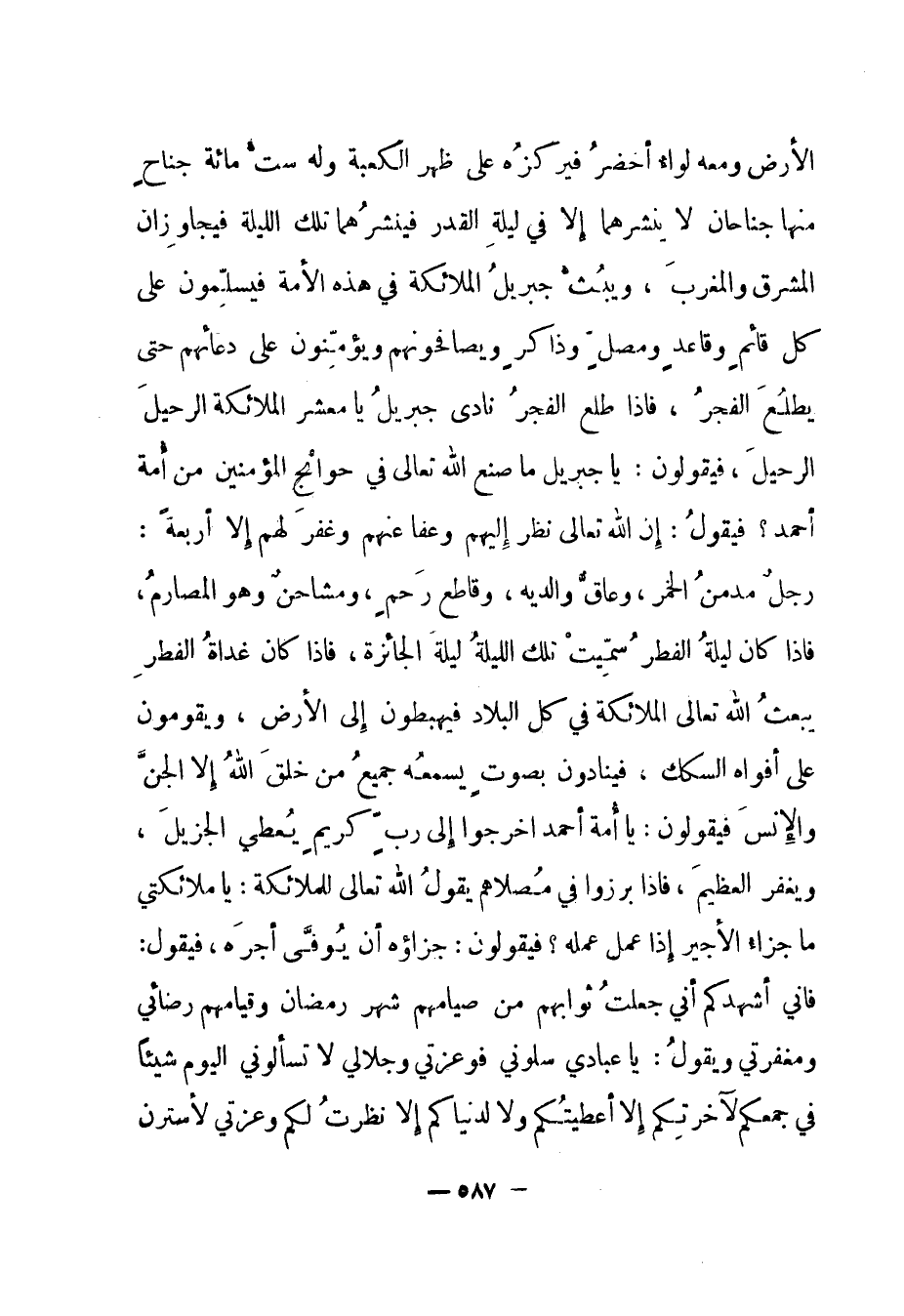 الأرض ومعه لواء أخضر فيركزه على ظهر الكعبة وله ست مائة جناح منها جناحان لا ينشرهما إلا في ليلة القدر فينشرهما تلك الليلة فيجاوزان المشرق والمغرب، ويبث جبريل الملائكة في هذه الأمة فيسلمون على كل قائم وقاعد ومصل وذاكر ويصافحونهم ويؤمنون على دعائهم حتى يطلع الفجر، فاذا طلع الفجر نادى جبريل يا معشر الملائكة الرحيل الرحيل، فيقولون: يا جبريل ما صنع الله تعالى في حوائج المؤمنين من أمة أحمد؟ فيقول: إن الله تعالى نظر إليهم وعفا عنهم وغفر لهم إلا أربعة: رجل مدمن الخمر، وعاق والديه، وقاطع رحم، ومشاحن وهو المصارم، فاذا كان ليلة الفطر سميت تلك الليلة ليلة الجائزة، فاذا كان غداة الفطر يبعث الله تعالى الملائكة في كل البلاد فيهبطون إلى الأرض، ويقومون على أفواه السكك، فينادون بصوت يسمعه جميع من خلق الله إلا الجن والإنس فيقولون: يا أمة أحمد اخرجوا إلى رب كريم يعطي الجزيل، ويغفر العظيم، فاذا برزوا في مصلاهم يقول الله تعالى للملائكة: يا ملائكتي ما جزاء الأجير إذا عمل عمله؟ فيقولون: جزاؤه أن يوفى أجره، فيقول: فاني أشهدكم أني جعلت ثوابهم من صيامهم شهر رمضان وقيامهم رضائي ومغفرتي ويقول: يا عبادي سلوني فوعزتي وجلالي لا تسألوني اليوم شيئا في جمعكم لآخرتكم إلا أعطيتكم ولا لدنياكم إلا نظرت لكم وعزتي لأسترن