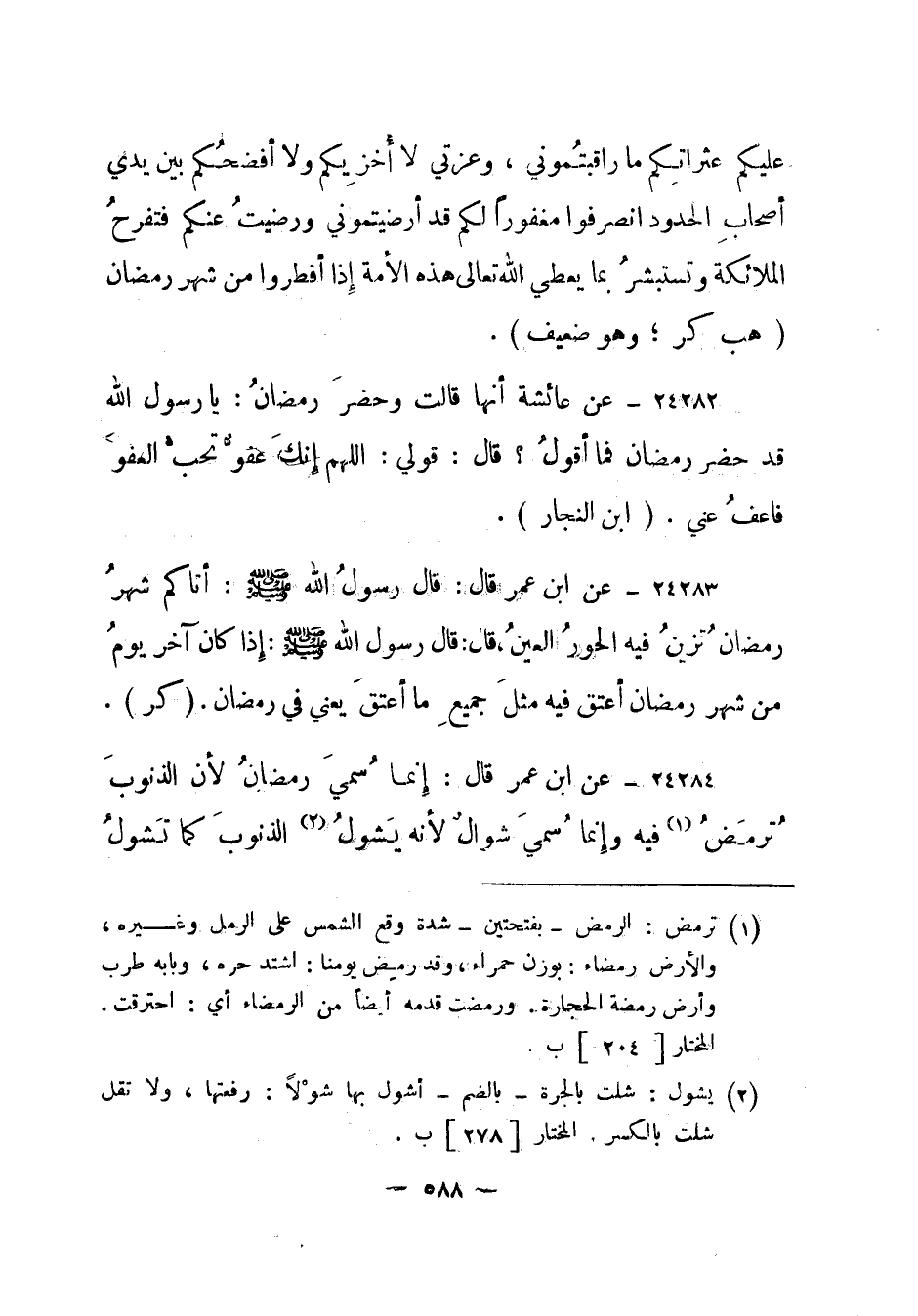 24284- عن ابن عمر قال: "إنما سمي رمضان لأن الذنوب ترمض 1 فيه وإنما سمي شوال لأنه يشول 2 الذنوب كما تشول