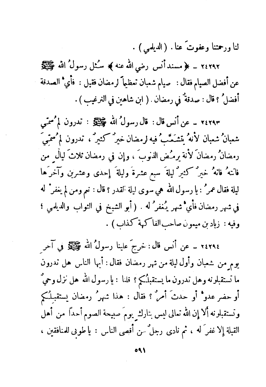 24292- "مسند أنس رضي الله عنه" سئل رسول الله صلى الله عليه وسلم عن أفضل الصيام فقال: "صيام شعبان تعظيما لرمضان فقيل: فأي الصدقة أفضل؟ قال: صدقة في رمضان". "ابن شاهين في الترغيب".