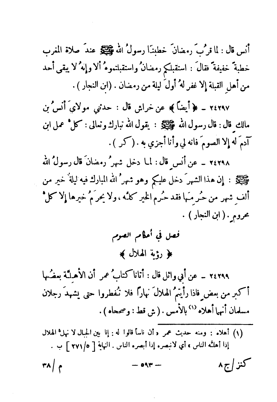 24298- عن أنس قال: "لما دخل شهر رمضان قال رسول الله صلى الله عليه وسلم: إن هذا الشهر دخل عليكم وهو شهر الله المبارك فيه ليلة خير من ألف شهر من حرمها فقد حرم الخير كله، ولا يحرم خيرها إلا كل محروم". "ابن النجار".