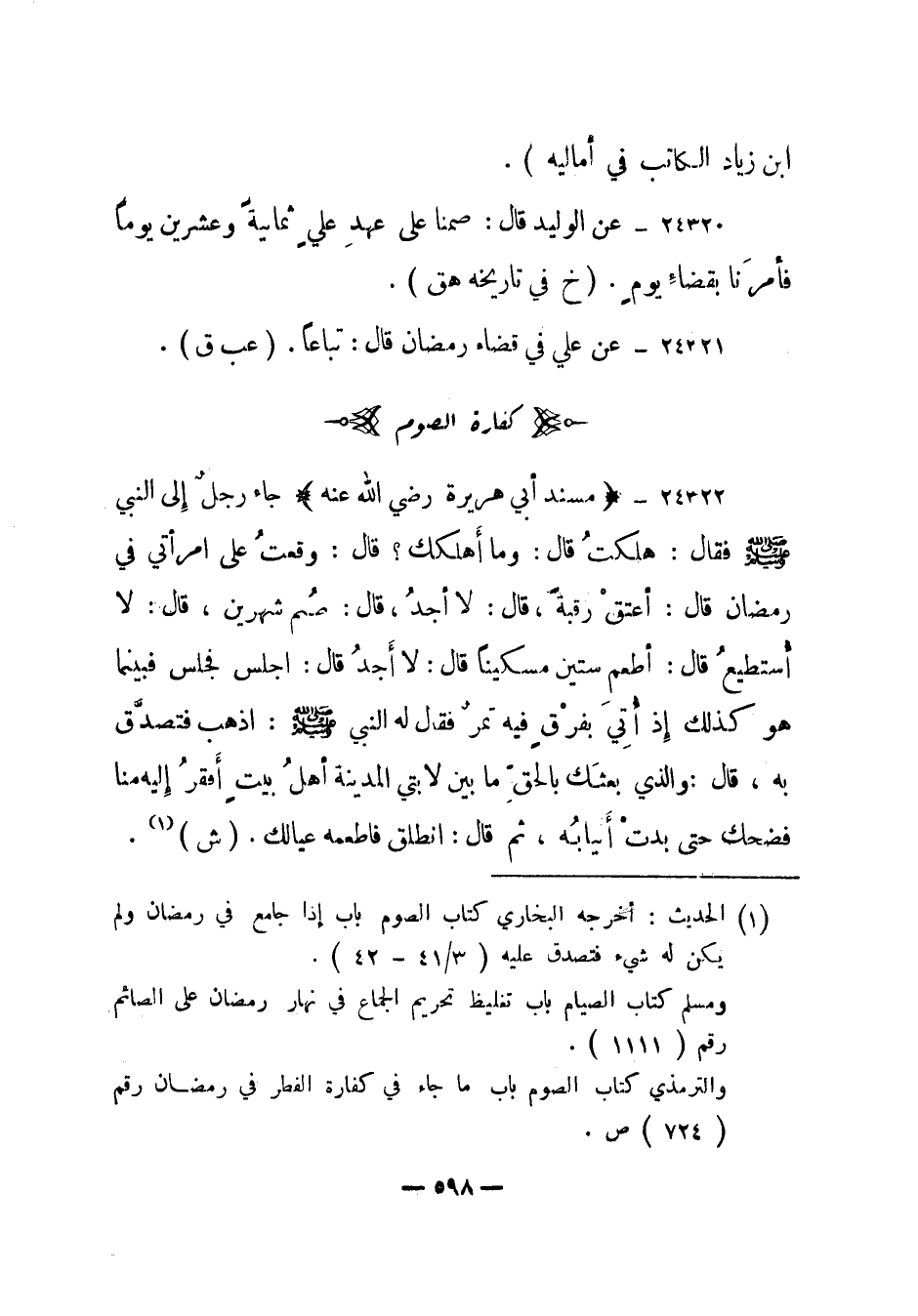 24322- "مسند أبي هريرة رضي الله عنه" جاء رجل إلى النبي صلى الله عليه وسلم فقال: "هلكت قال: وما أهلكك؟ قال: وقعت على امرأتي في رمضان قال: أعتق رقبة، قال: لا أجد، قال: صم شهرين، قال: لا أستطيع قال: أطعم ستين مسكينا قال: لا أجد قال: اجلس فجلس فبينما هو كذلك إذ أتي بفرق فيه تمر فقال له النبي صلى الله عليه وسلم: اذهب فتصدق به، قال: والذي بعثك بالحق ما بين لابتي المدينة أهل بيت أفقر إليه منا فضحك حتى بدت أنيابه، ثم قال: انطلق فأطعمه عيالك". "ش" 1
