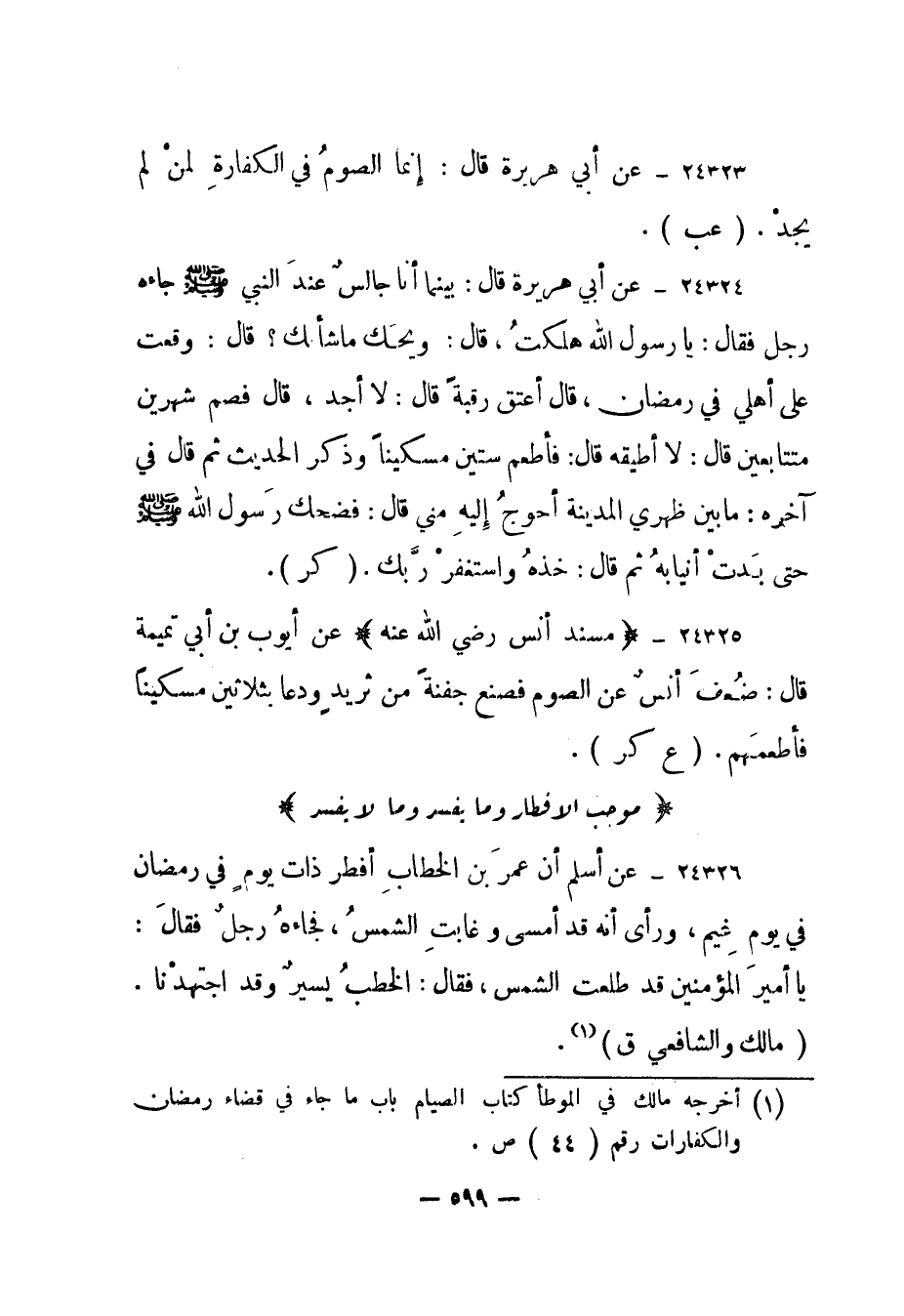 24326- "عن أسلم أن عمر بن الخطاب أفطر ذات يوم في رمضان في يوم غيم، ورأى أنه قد أمسى وغابت الشمس، فجاءه رجل فقال: يا أمير المؤمنين قد طلعت الشمس، فقال: الخطب يسير وقد اجتهدنا". "مالك والشافعي ق" 1