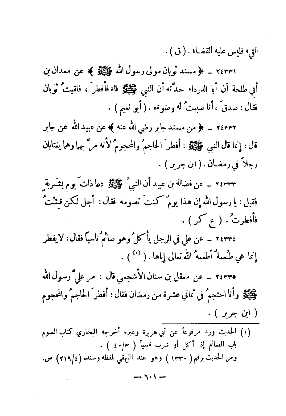 24335- عن معقل بن سنان الأشجعي قال: "مر علي رسول الله صلى الله عليه وسلم وأنا أحتجم في ثماني عشرة من رمضان فقال: أفطر الحاجم والمحجوم". "ابن جرير".