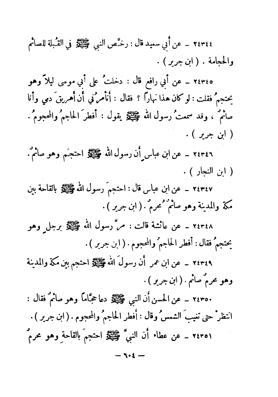 24349- "عن ابن عمر أن رسول الله صلى الله عليه وسلم احتجم بين مكة والمدينة وهو محرم صائم". "ابن جرير".
