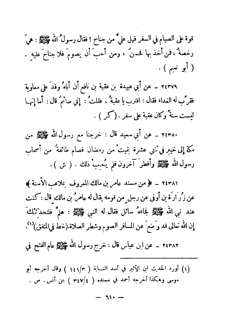 24379- عن أبي عبيدة بن عقبة بن نافع أن أباه وفد على معاوية فقرب له الغداء فقال: "اقترب يا عقبة، فقلت: إني صائم قال: أما إنها ليست سنة وكان عقبة على سفر". "كر".