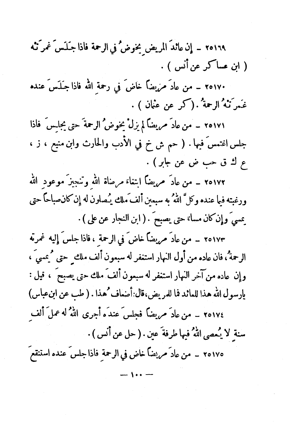 25170- "من عاد مريضا خاض في رحمة الله فإذا جلس عنده غمرته الرحمة". "كر عن عثمان".