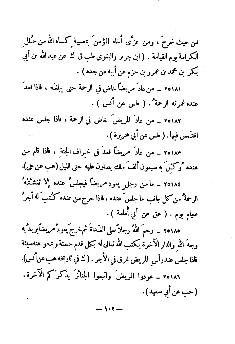 25183- "من عاد مريضا قعد في خراف الجنة، فإذا قام من عنده وكل به سبعون ألف ملك يصلون عليه حتى الليل". "هب عن علي".